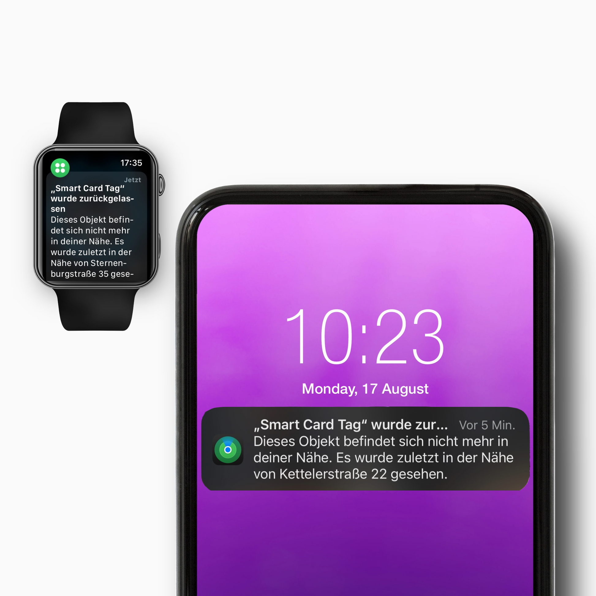 Ein Touch in der "Wo ist?"-App, und Deine Smart Card Tag ruft Dich! Bis zu 95 db laut in einem Umkreis von 50m.